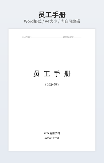 【特殊限制】设计师仅对作品中独创性部分享有著作权,对作品中含有的国旗、国徽等政治图案不享有权利,仅作为作品整体效果的示例展示,禁止商用。 相关关键词: 标准 公司 员工 手册 样本