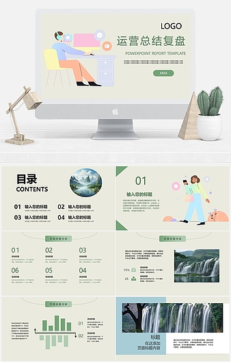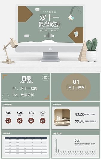 【特殊限制】设计师仅对作品中独创性部分享有著作权,对作品中含有的国旗、国徽等政治图案不享有权利,仅作为作品整体效果的示例展示,禁止商用。 相关关键词: 绿色 清新 双十 十一 复盘 模板