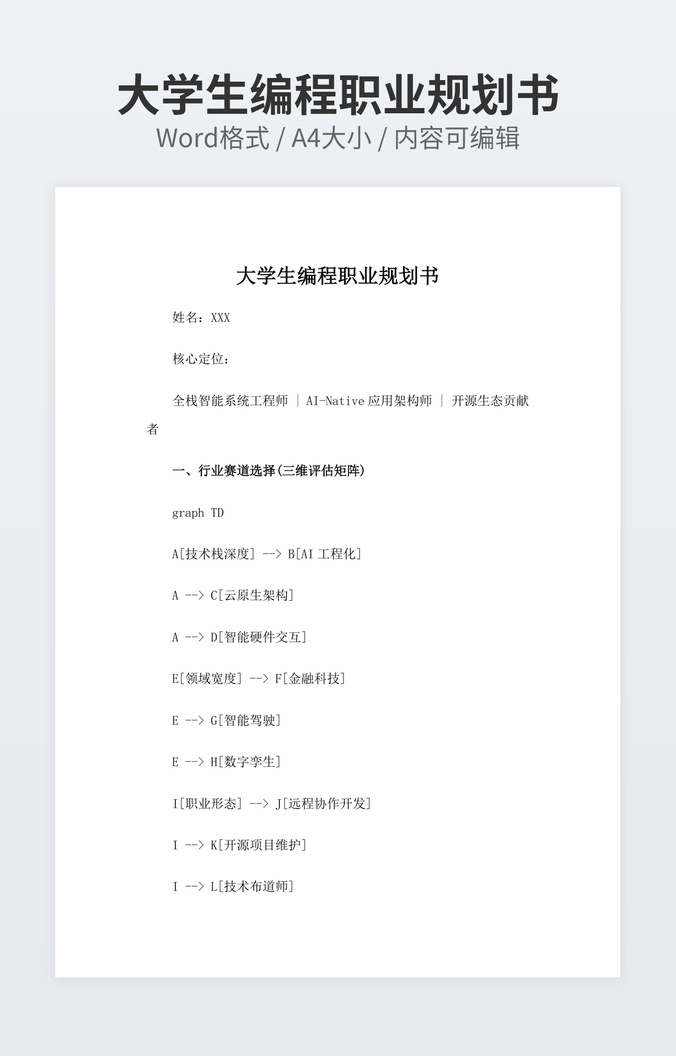 本作品内容为元宇宙时代艺术创变者职业规划下载,大小为13.72KB,作品为高清大图模板,格式为docx, 属于职业规划模板,作品模板源文件下载后可用编辑替换,模板中如有人物画像仅供参考禁止商用。小Q办公网-提供简历,PPT,Word,Excel优质模板素材下载模版平台,拥有海量的工作总结、竞聘求职、年终颁奖、计划书等。 通过小Q办公网下载职业规划模板源文件编辑修改源文件文字和图片即可使用。