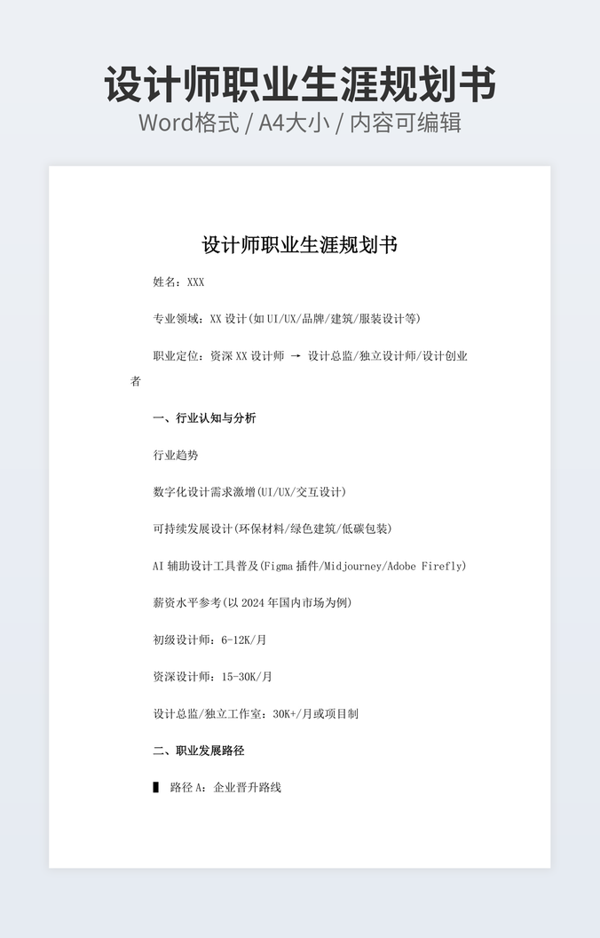 本作品内容为应届生职业规划书下载,大小为13.48KB,作品为高清大图模板,格式为docx, 属于职业规划模板,作品模板源文件下载后可用编辑替换,模板中如有人物画像仅供参考禁止商用。小Q办公网-提供简历,PPT,Word,Excel优质模板素材下载模版平台,拥有海量的工作总结、竞聘求职、年终颁奖、计划书等。 通过小Q办公网下载职业规划模板源文件编辑修改源文件文字和图片即可使用。