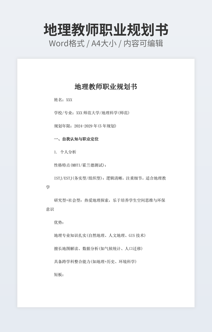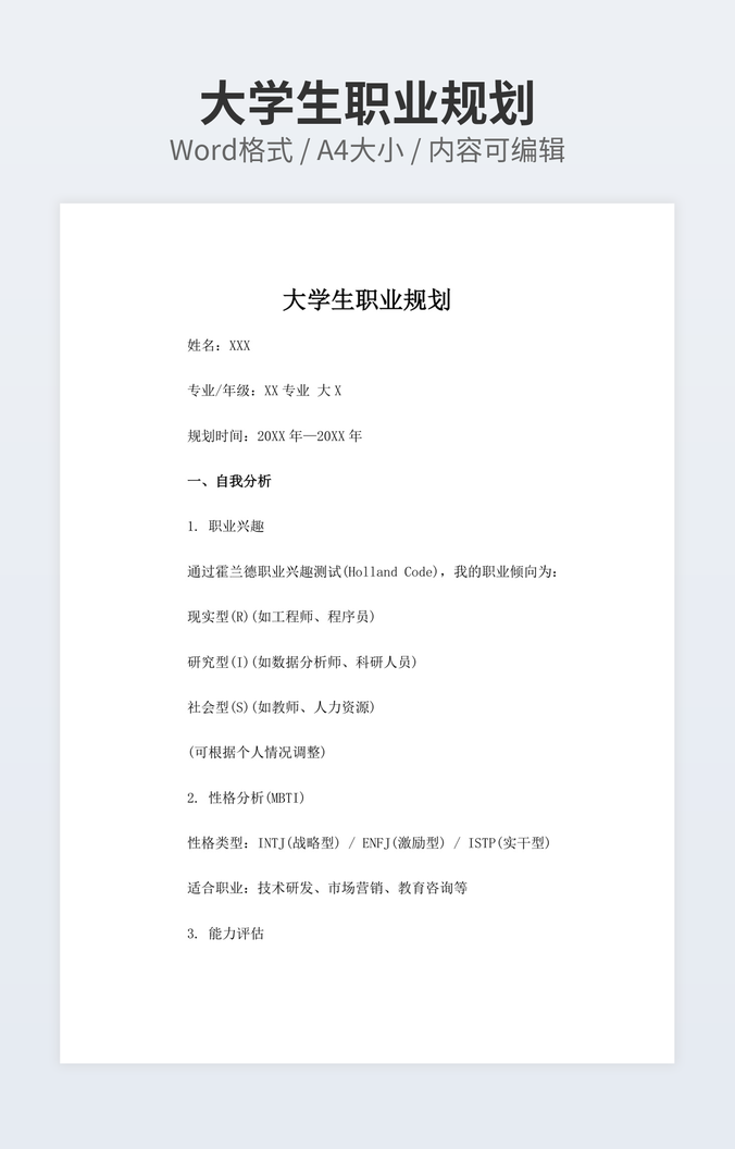本作品内容为金融学大学生职业规划书下载,大小为13.37KB,作品为高清大图模板,格式为docx, 属于职业规划模板,作品模板源文件下载后可用编辑替换,模板中如有人物画像仅供参考禁止商用。小Q办公网-提供简历,PPT,Word,Excel优质模板素材下载模版平台,拥有海量的工作总结、竞聘求职、年终颁奖、计划书等。 通过小Q办公网下载职业规划模板源文件编辑修改源文件文字和图片即可使用。